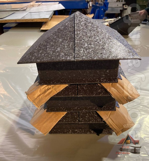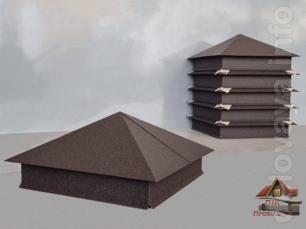 Ковпаки пірамідальні та плоскі за розмірами Ваших стовпчиків від виробника. Ковпаки крім декоративної функції виконують ще захисну функцію від опадів і також можна використовувати за основу для кріплення ліхтарів, елементів декору.