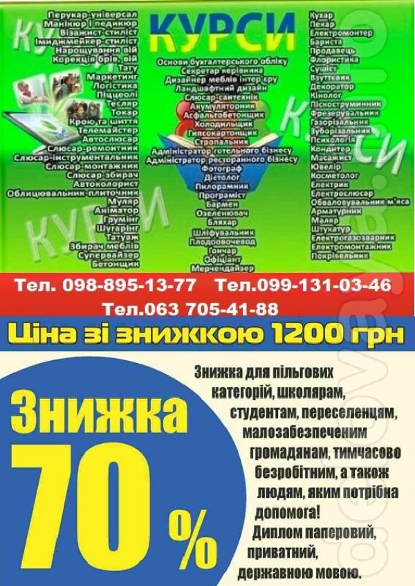 Курси перукар - універсал, манікюр і педикюр, візажіст - стиліст, імиджмейкер - стиліст, нарощування вій, тату, маркетинг, логістика, корекція брів вій, піццеола, тесля, токар, крою та шиття, телемайстер, автослюсар, слюсар ремонтник, слюсар інструментальник, слюсар монтажник, слюсар збирач , автоколоріст, муляр, аніматор, грумінг, шугарінг, татуаж, зборщик меблів, супервайзер, облицювальник плиточник, бухгалтер, адміністратор ресторанного бізнесу, адміністратор готельного бізнесу, секретар, дизайнер меблів інтер'єру, ландшафтний дизайнер, слюсар сантехнік, акумуляторникк, асфальтобетонщик, холодильщик, гипсокортонщик, стропальник, фотограф, діетолог, пилорамник, прогаміст, бармен, озеленювач, бляхар, шліфувальщік, плодоовочевод, гончар, офіціант, мерчендайзер, годинникар, ораторської майстерність, туроператор, охоронець, кухар, пекар, барист, продавець, флористика, сушіст, взуттєвик, обвальщик м'яса, декоратор, кінол