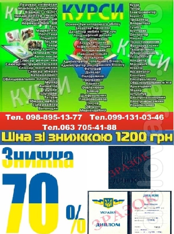 Курси перукар - універсал, манікюр і педикюр, візажіст - стиліст, імиджмейкер - стиліст, нарощування вій, тату, маркетинг, логістика, корекція брів вій, піццеола, тесля, токар, крою та шиття, телемайстер, автослюсар, слюсар ремонтник, слюсар інструментальник, слюсар монтажник, слюсар збирач , автоколоріст, муляр, аніматор, грумінг, шугарінг, татуаж, зборщик меблів, супервайзер, облицювальник плиточник, бухгалтер, адміністратор ресторанного бізнесу, адміністратор готельного бізнесу, секретар, дизайнер меблів інтер'єру, ландшафтний дизайнер, слюсар сантехнік, акумуляторникк, асфальтобетонщик, холодильщик, гипсокортонщик, стропальник, фотограф, діетолог, пилорамник, прогаміст, бармен, озеленювач, бляхар, шліфувальщік, плодоовочевод, гончар, офіціант, мерчендайзер, годинникар, ораторської майстерність, туроператор, охоронець, кухар, пекар, барист, продавець, флористика, сушіст, взуттєвик, обвальщик м'яса, декоратор, кінолог, пескострумнник, фрезерувальник, газорізальник, зуборізальник, пси